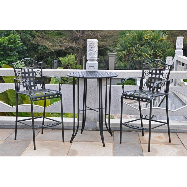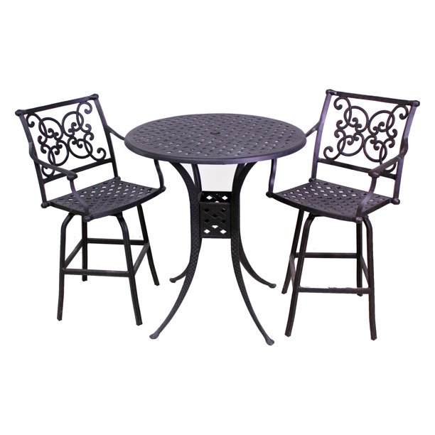 3 Piece Bar Height Patio Bistro Set. The bistro patio chairs come in an elegant design featuring stylish, curvy arms, and legs. Bistro sets compliment your patio, deck or pool area perfectly. This classic patio table and chairs set will add a unique and eclectic addition to your garden, courtyard, or indoor living area.