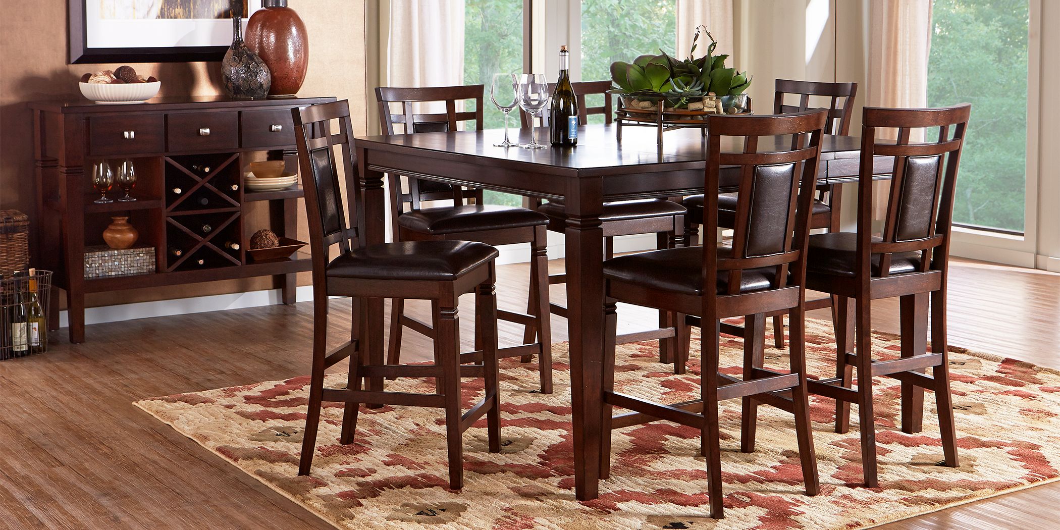 The table features an elegant tulip base and a beveled glass tabletop that provides an open, airy feel. With a rich cherry finish, a smooth, contoured table top and a casual yet sophisticated veneer table design, this dining set will add a polished feel to your home. It is made of ash veneers and finished in a rich black tone. Coaster mix & match 9pc counter height pub table in cappuccino finish.