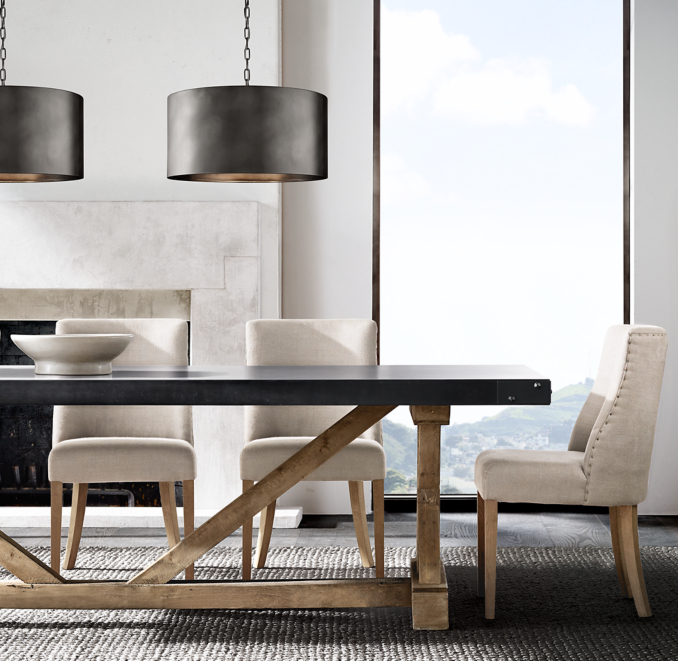 X Base Dining Table. The table's rich stain hue highlights the wood's natural grain, creating a subtle sunburst effect. Rounding out the design, the architectural pedestal base includes four angular legs that give this piece a touch of industrial style. This super easy x base farmhouse table can be built for about $50.